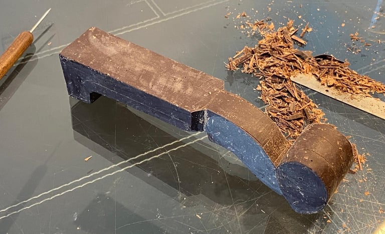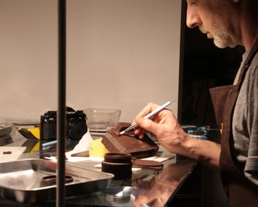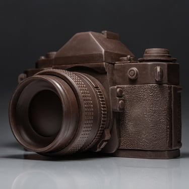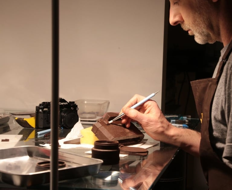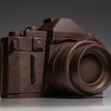 These pieces are made to push the limits of what can be done with chocolate. They explore how chocolate can mimic different materials and take on different qualities with the right sculpting techniques. Great attention is given to fool the viewer into believing that this can't be chocolate despite the surfaces being left unsprayed so you can see the chocolate with its small imperfections. All the objects are created by joining separate blocks and hand carving the required forms, before patiently adding the details.