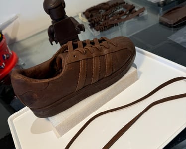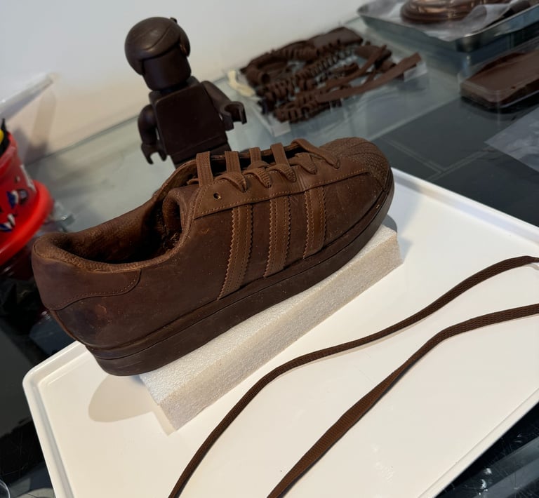 Inspired by the ubiquitous Adidas Superstar, this size-5 chocolate sneaker is made to look slightly worn and to fool you into thinking it's leather. It's all chocolate, even the laces!